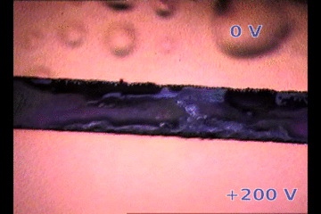 | Parylene/Gold cathode “bubbling” on top of a biased perovskite thin film releasing gases. The perovksite fringe between electrodes is ~100 micrometers width. 200V/100um is an electric field similar to suffered by 1 um thick perovskite layer on solar cells |